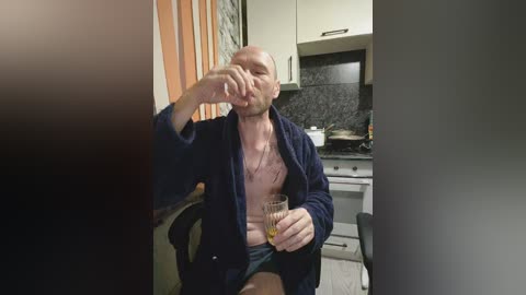 _hennessy_ - A video of a topless woman with medium-sized breasts, drinking from a yellow container, wearing black garter belt, in a striped shower curtain background.
